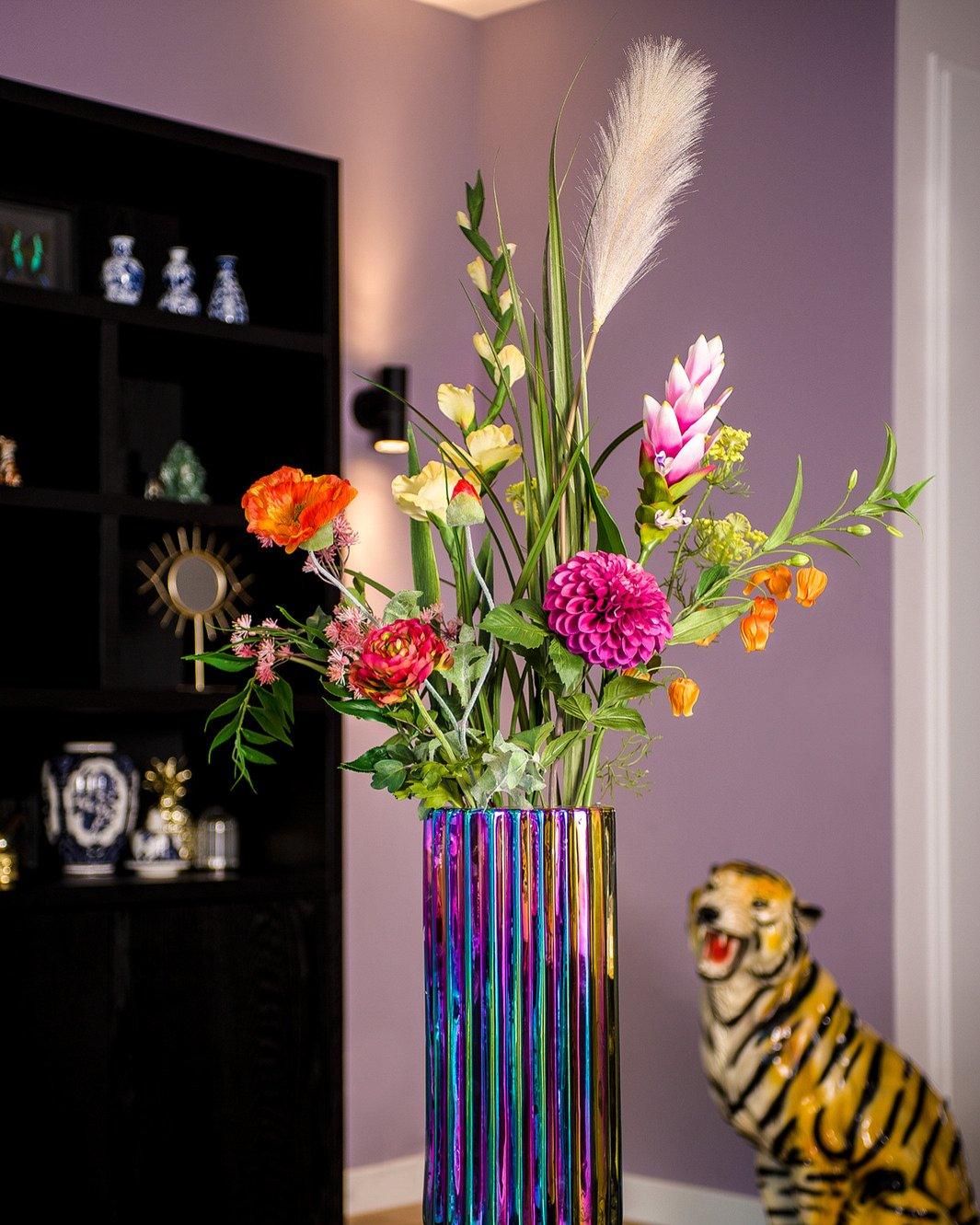 Met dit boeket breng je kleur en liefde in elke ruimte. De mix van felgekleurde cosmos, zachte matthiola en elegante dahlia's, omgeven door weelderig groen, maakt het tot een echte eyecatcher. Gemaakt van hoogwaardige zijden bloemen, blijft het boeket altijd prachtig zonder ooit te verwelken.